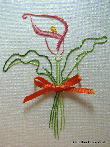 Another very simple card: calla lily. I used variegated DMC floss to stitch it. I will show just the lily itself. The card was very simple, there's nothing to show, except for the flower.